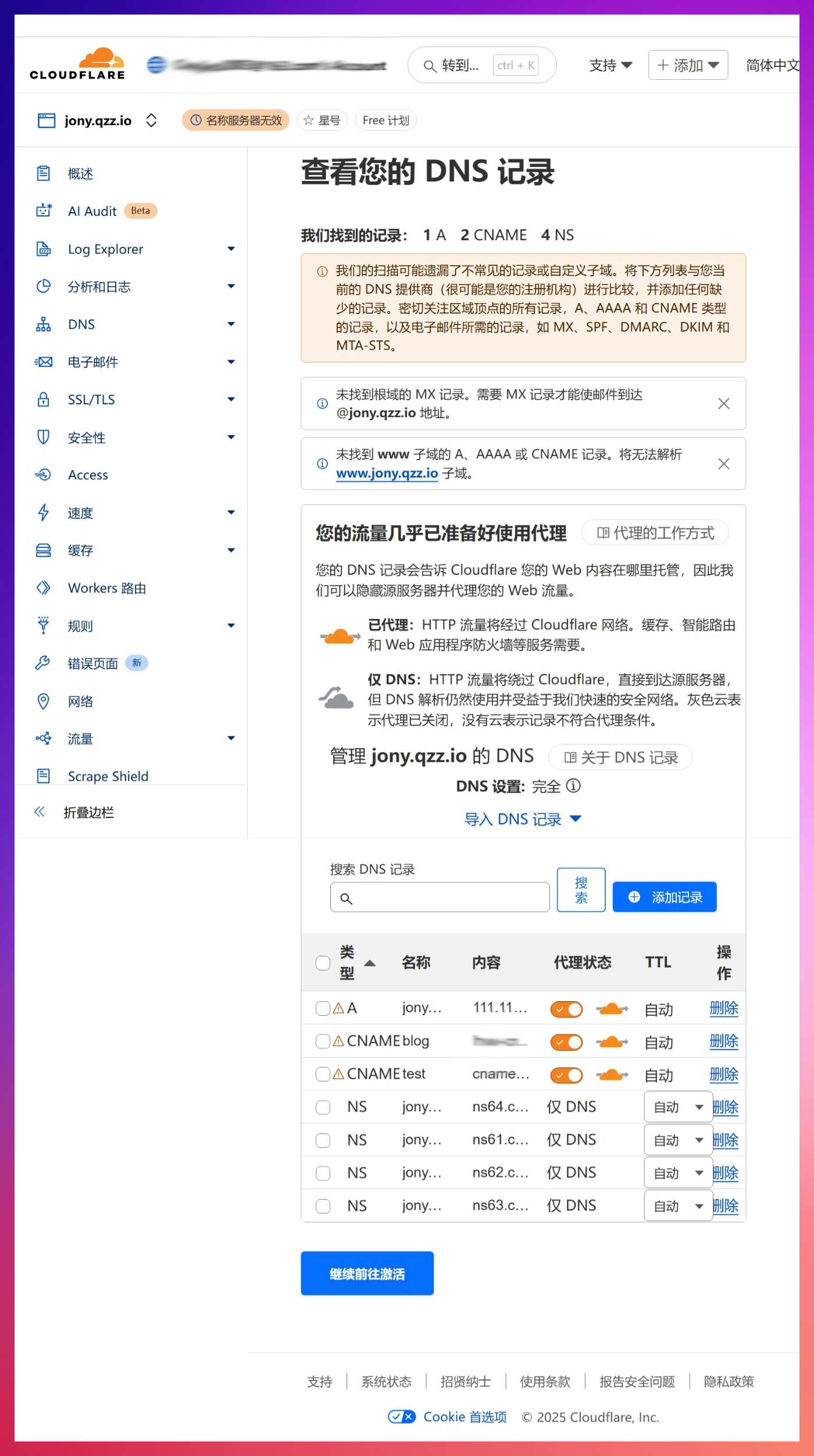 - 这时Cloudflare会搜索你的域名DNS记录,我是之前已经托管在Cloudns上了,所以会搜到几条解析记录,见下图,其中NS记录为托管在Cloudns的DNS解析服务器,这里不用了把它们选中删除。然后点底部【继续前往激活】